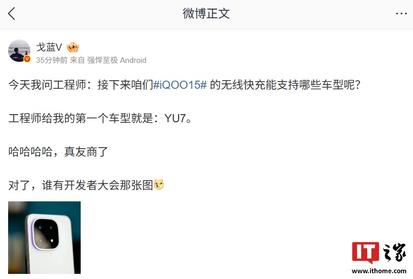 iQOO 居品司理 @戈蓝V 发文解析了 iQOO 15 手机无线快充适配车型,称工程师请教他的第一款车型等于 YU7(此处瞻望指小米 YU7),并嘉赞是真友商。