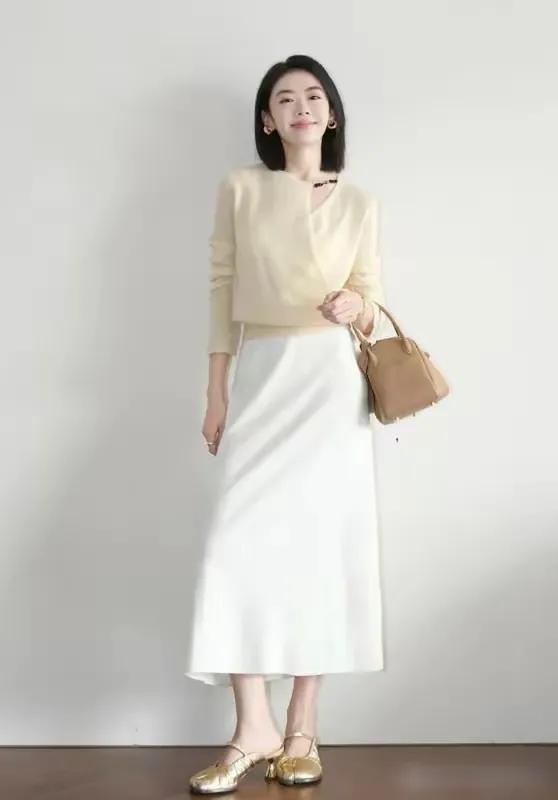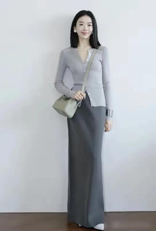 我岂论是发型也好,衣裳也罢,脸色尽量不要过于花哨,若是你可爱染发的话,多选一些板栗棕色,深棕色的发色会更妥当我们常常大师秉承衣裳脸色,黑白灰基础颜色更百搭,不挑东说念主不挑年齿,举例底下用灰色的诚挚开衫搭配上灰色的鱼尾半身裙,脚踩一对白色的浅口单鞋,轻猖厥松穿出高等感。