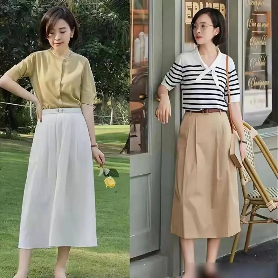诚然,若是你是中年女性,同期又是小个子女生,我们不错鉴戒底下这位达东说念主的打扮神色,用一款皆肩项方针波波头短发造型,搭配上诚挚开衫和一款直筒半身裙和伞状半身裙就够,这么的穿衣打扮澄莹干净利落又和煦大方。